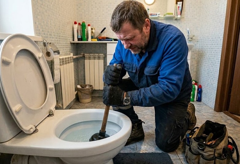 The first mistake is flushing repeatedly in the hope that the water will “push it through on its own.” In practice, this is often what causes the toilet to overflow: the drain is already blocked, so the new water just raises the water level in the bowl and makes the situation worse.